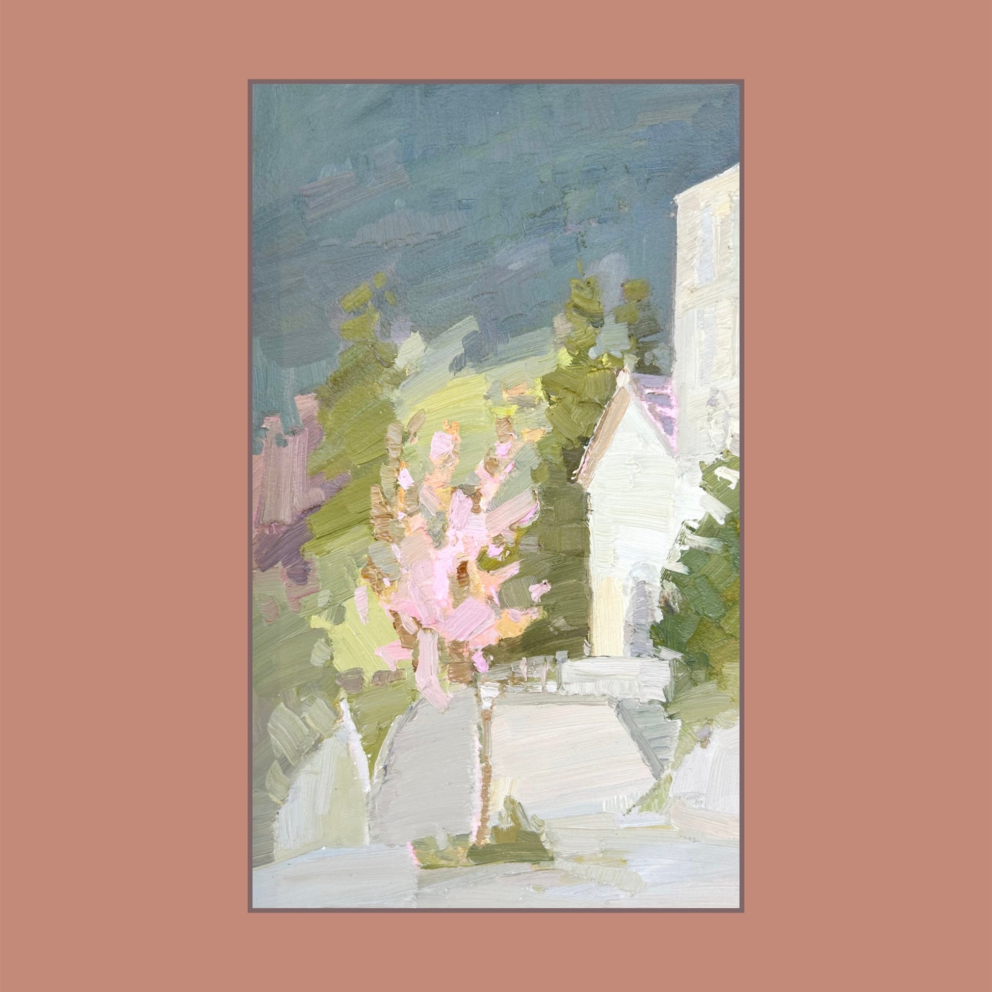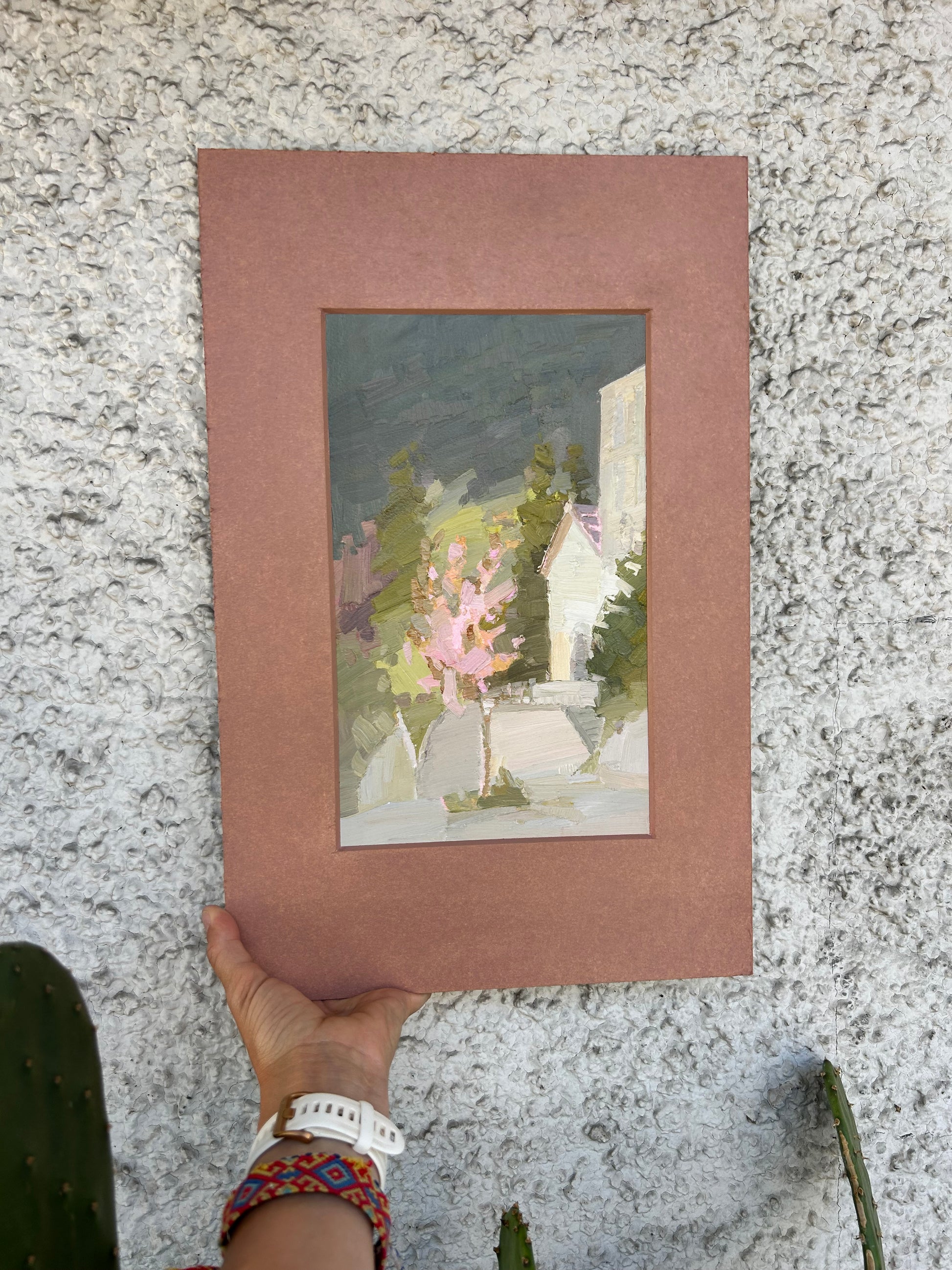 Villars-sur-Ollon. Blooming tree in front of the Temple. 15.05.2025. 16x27cm