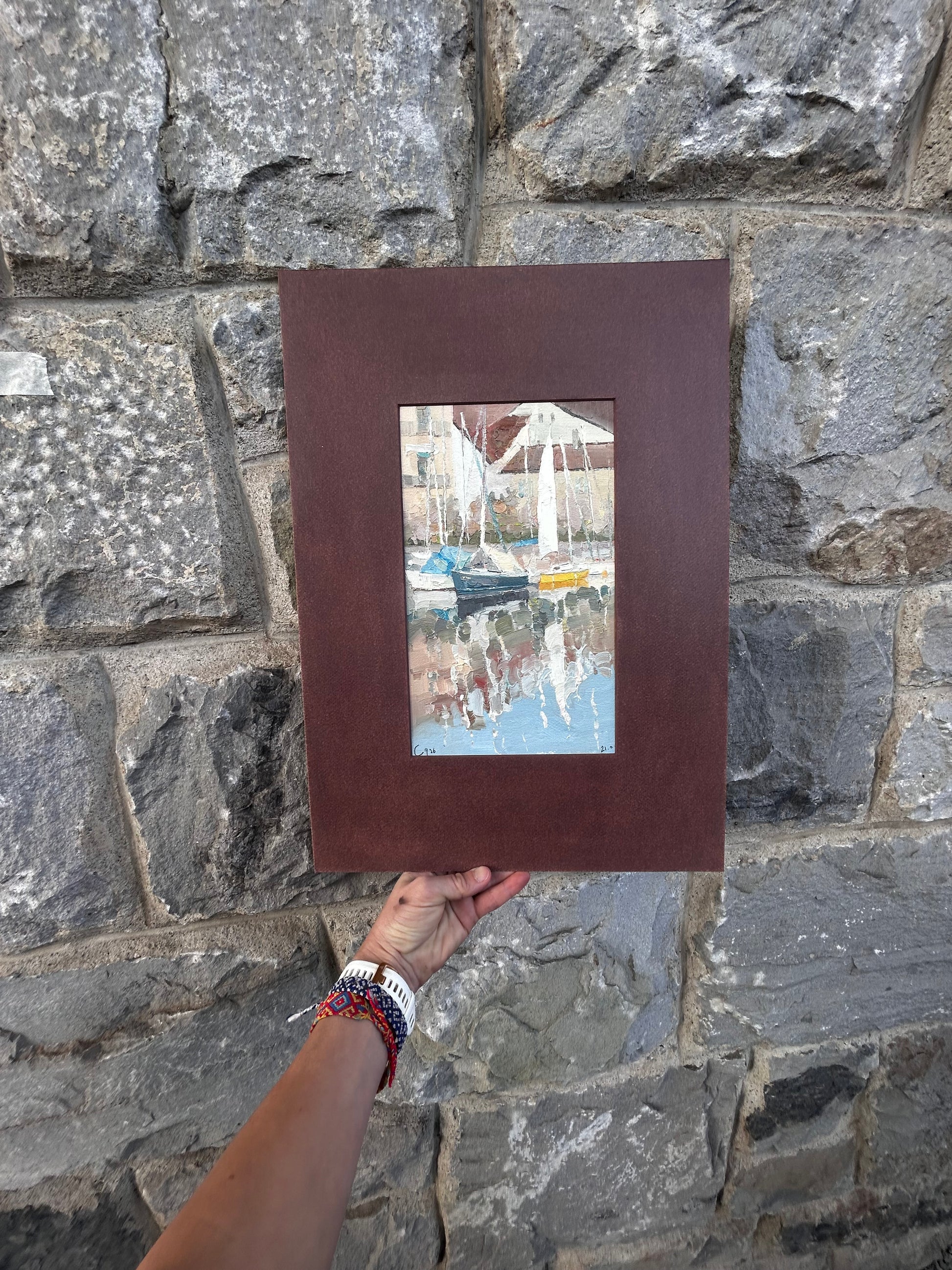 Blue and yellow boats in Lutry port in January, 21.01.2026. 16.5x27.5 cm